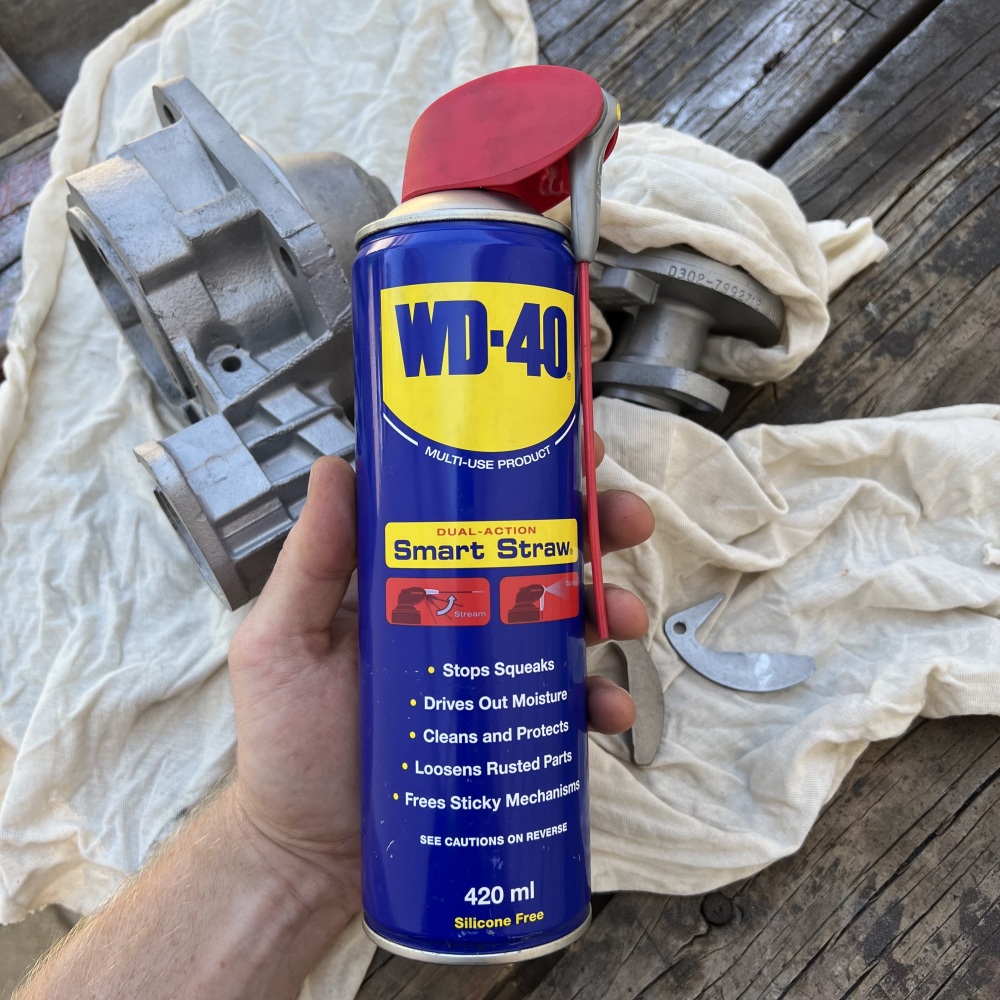 Any time I repair parts like this, I use a liberal application of WD-40 to drive out any remaining moisture from hard-to-reach places. Additionally, I use it to coat all the components, as it seals and protects the newly-blasted steel and aluminium from oxidation and rust, while the parts await fitment. Finally, the lubrication of the WD-40 helps keep the assembly process smooth. I personally prefer the Smart Straw cans, as I use them both for lubricating complex assemblies (like this Delco), and for protecting large areas (like my welding fixture table, on which this project is being reassembled).