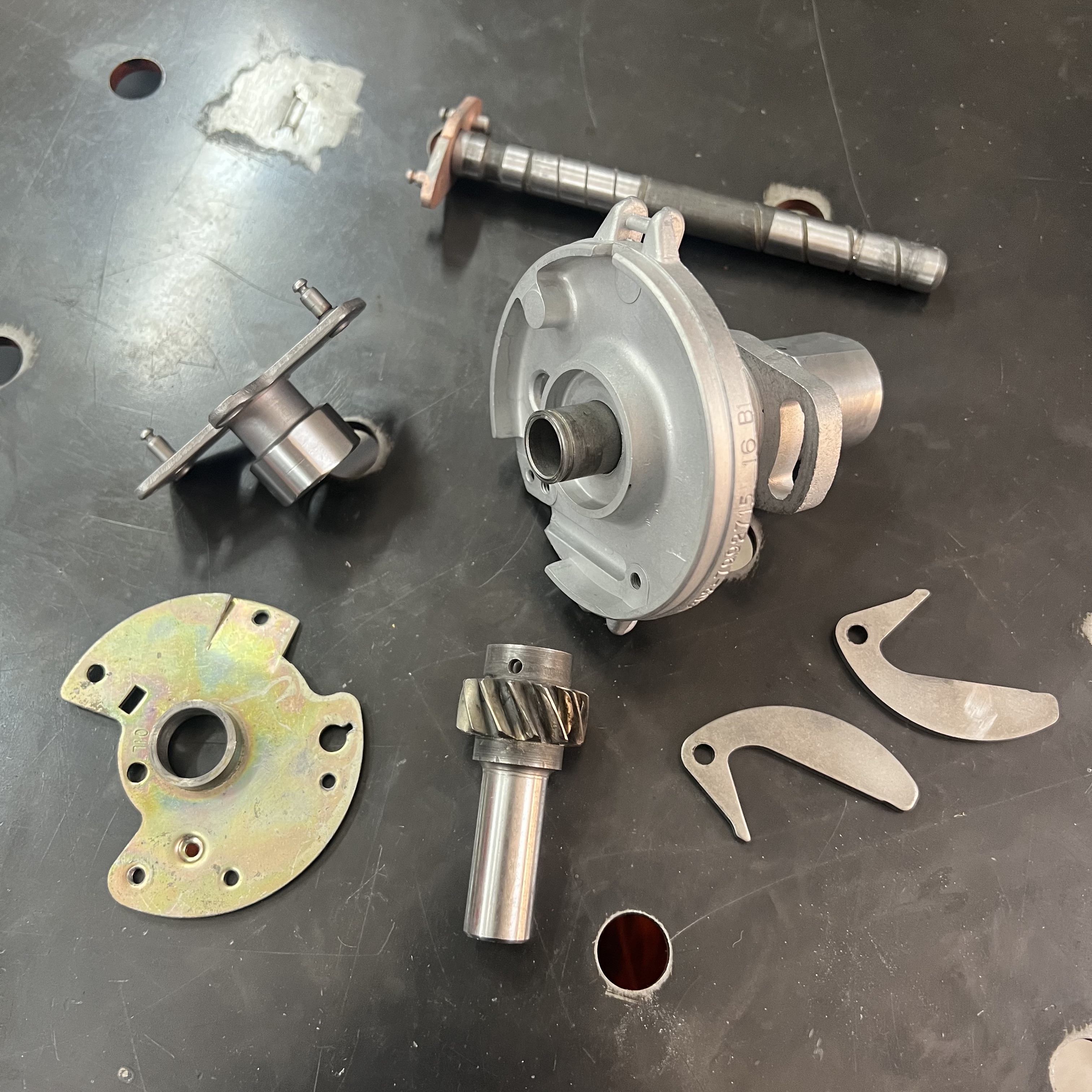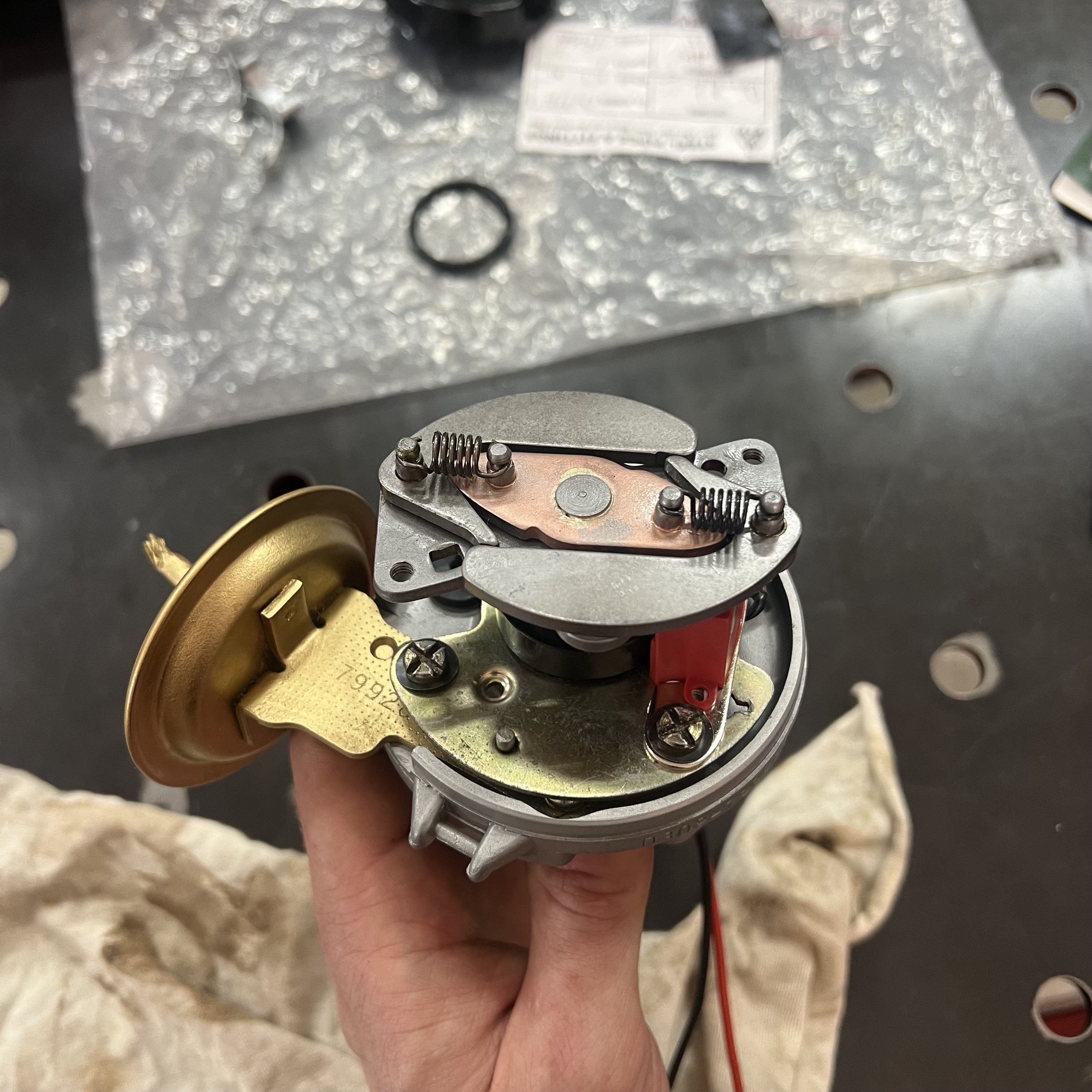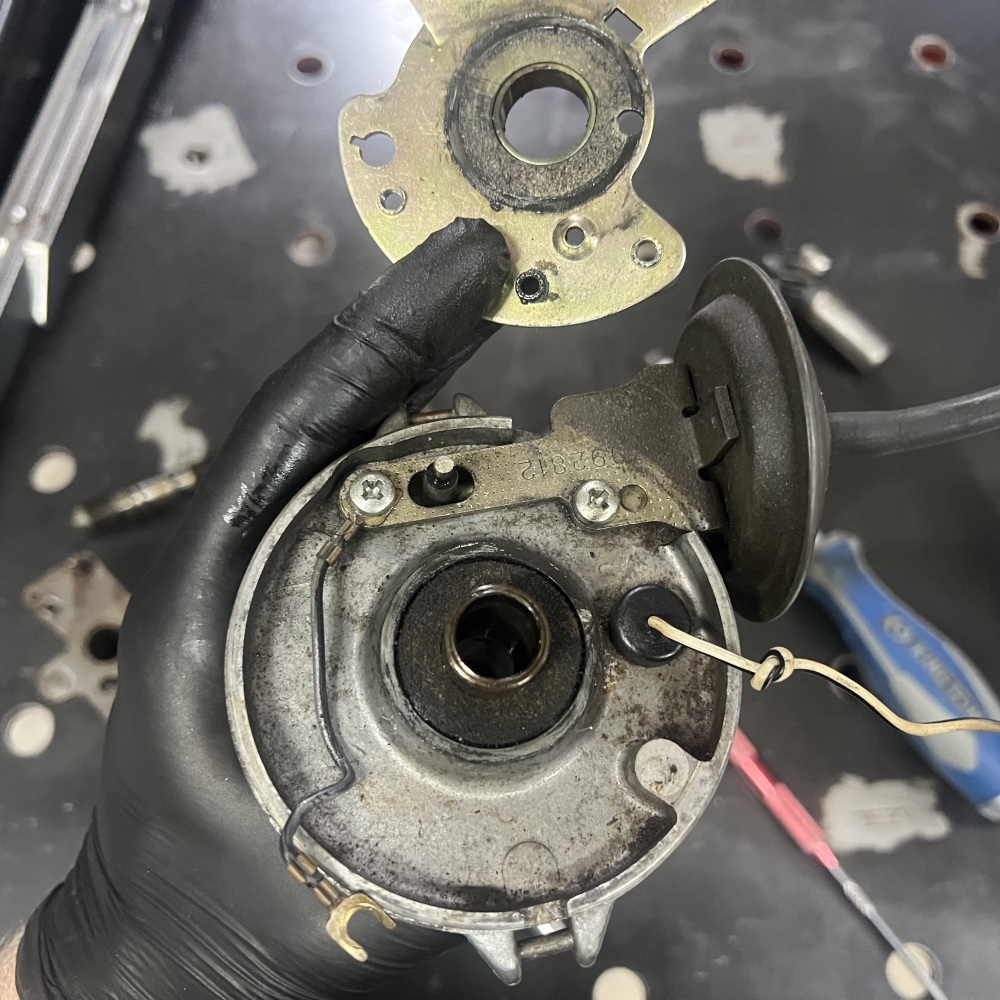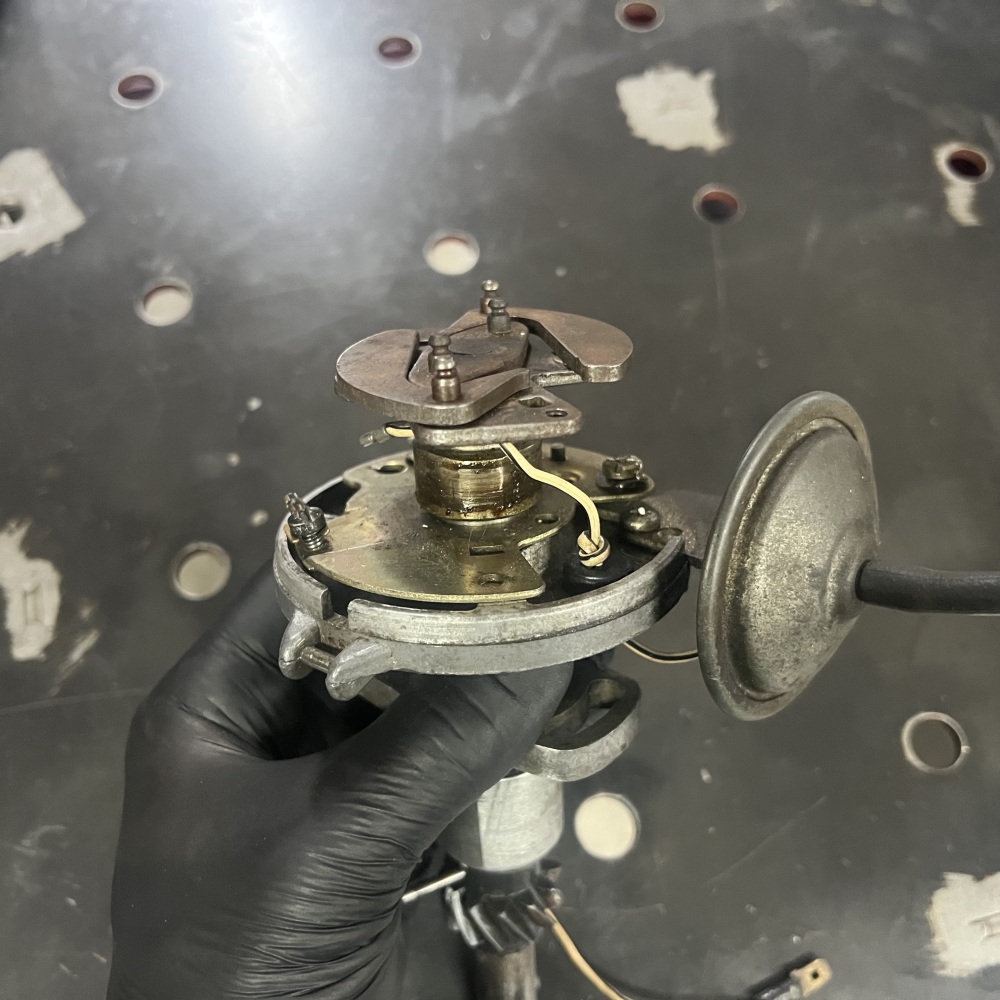 Here, you can see that the Delco arrived in my workshop missing a lot of parts. The most obvious ones are the rotor - a large black plastic part that is meant to be on top of all of this - and the distributor cap, which covers everything up and provides places to plug in your spark plug wires. There are no springs on the advance weights, which alter the timing of the spark plugs' firing throughout the rev range of the engine; the clips that hold down the distributor's cap are missing; and there are no contact points, which 'make' and 'break' the electrical connection that gives each spark plug the signal to fire. It looks like a previous owner tried to disassemble this before, but had to stop the process halfway.