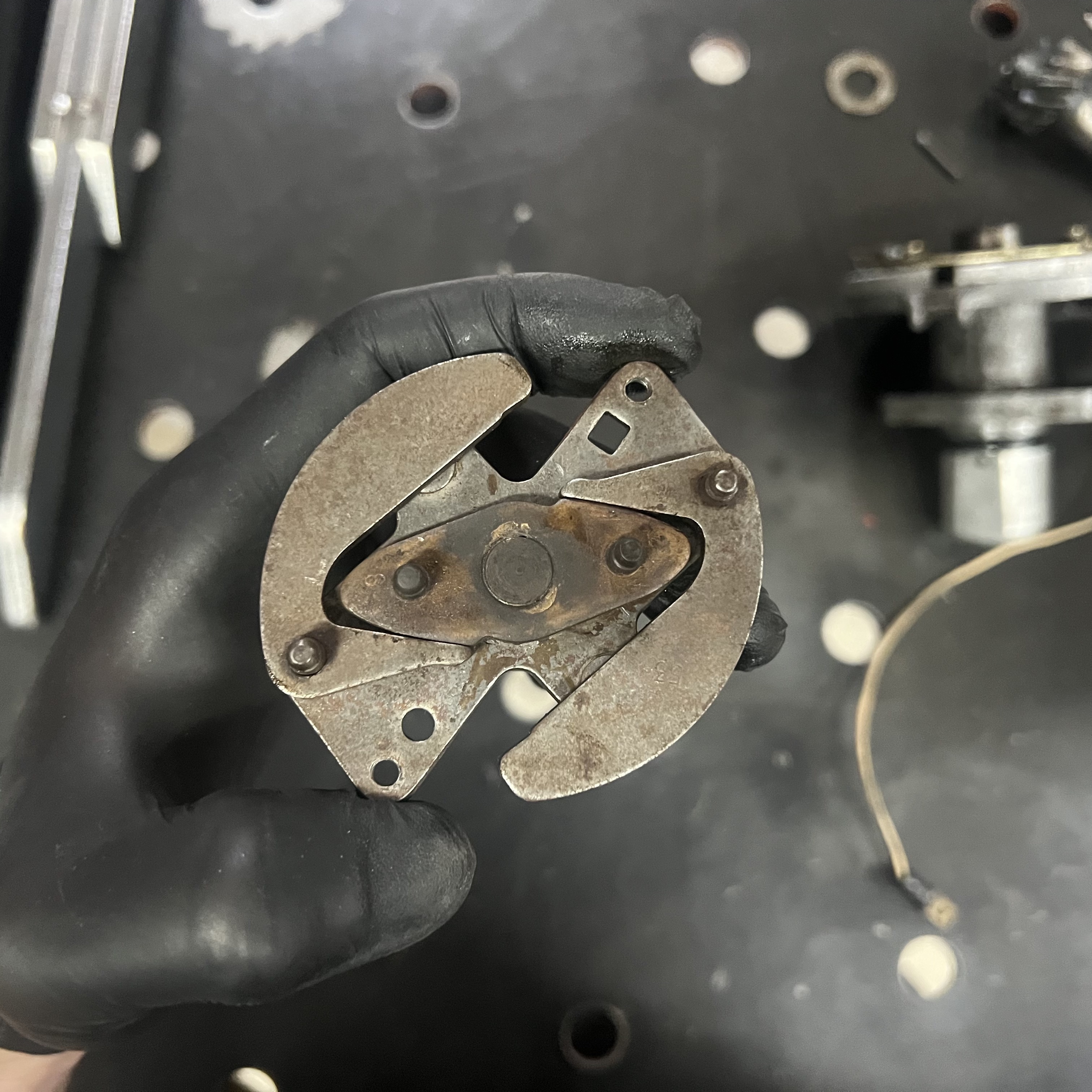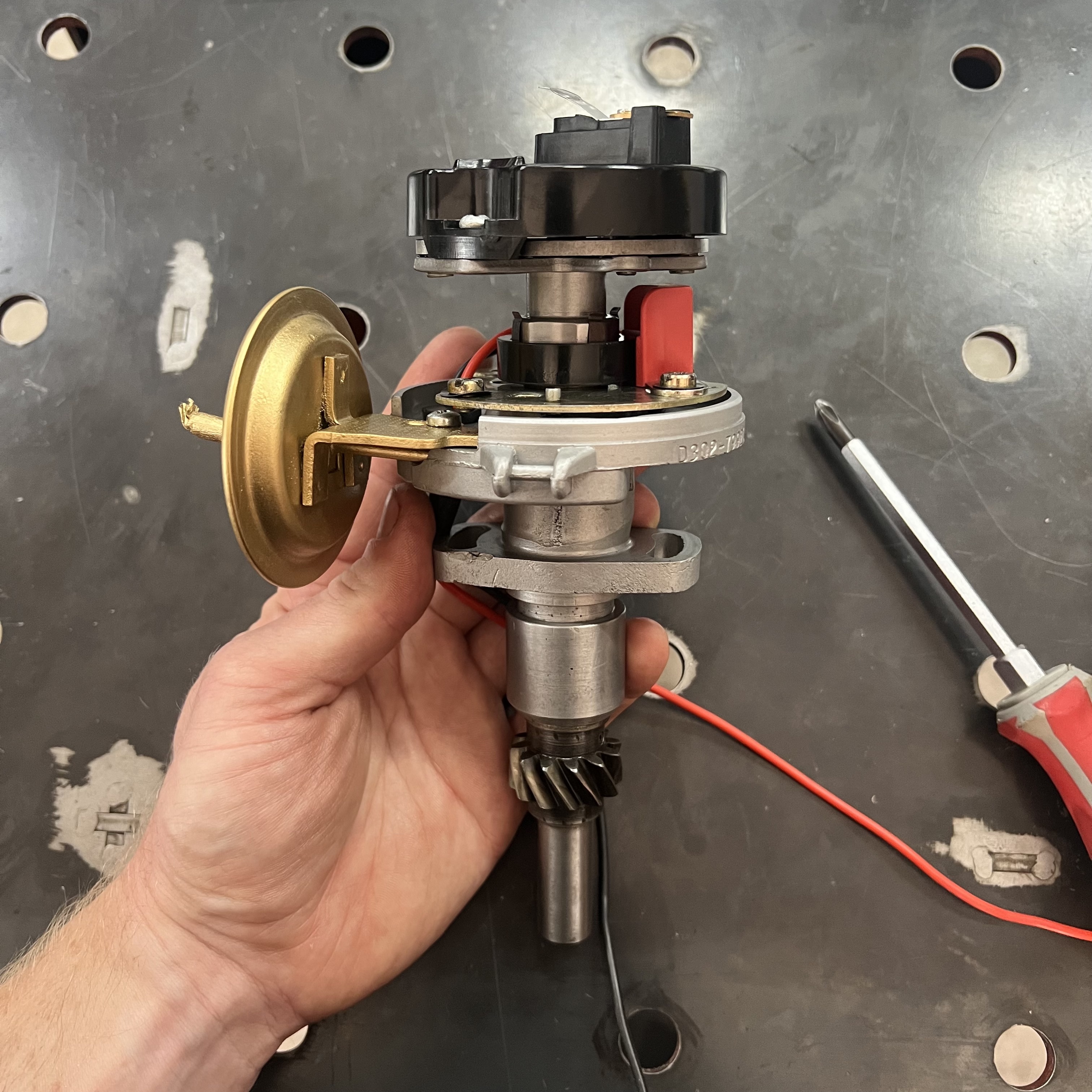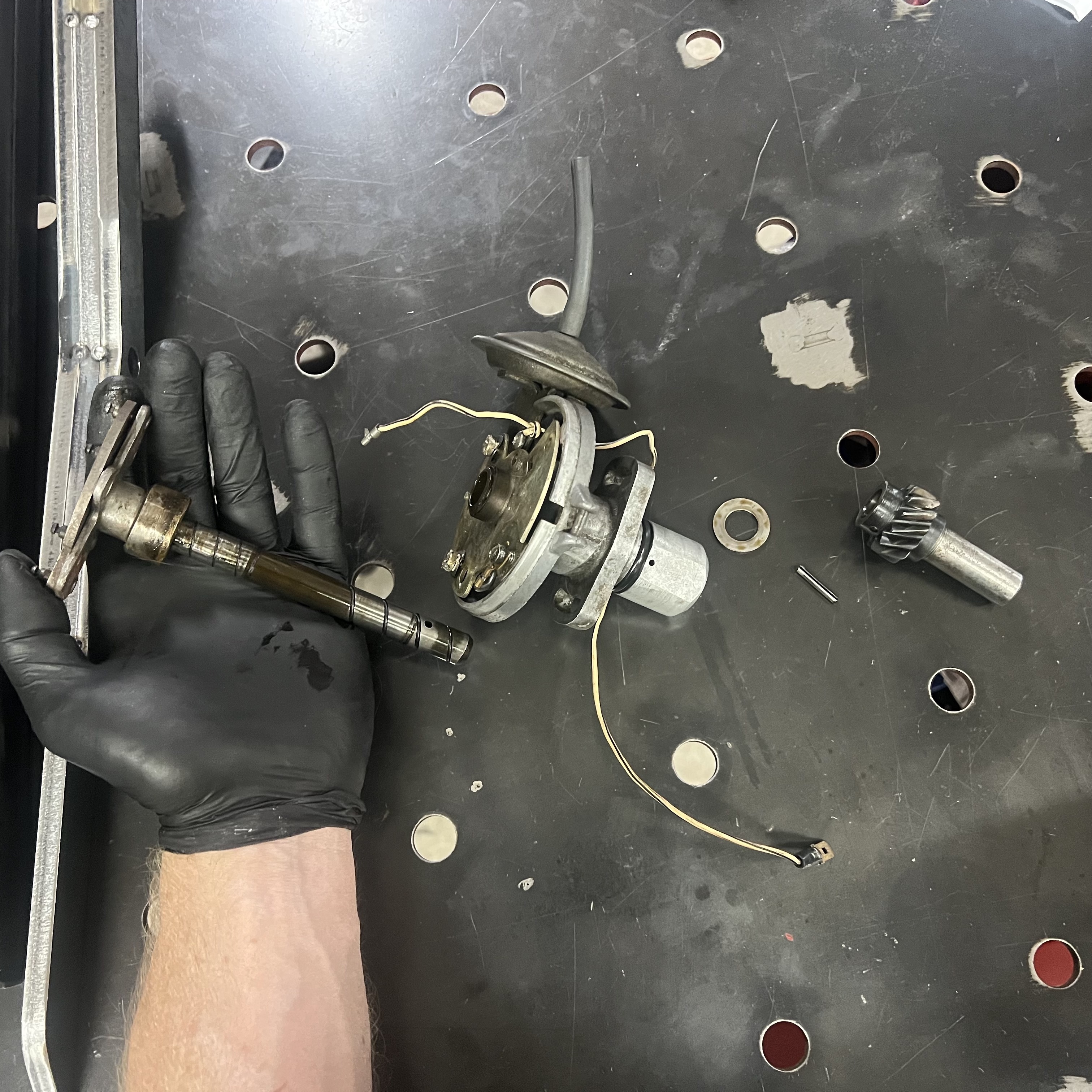 Here, you can see that the Delco arrived in my workshop missing a lot of parts. The most obvious ones are the rotor - a large black plastic part that is meant to be on top of all of this - and the distributor cap, which covers everything up and provides places to plug in your spark plug wires. There are no springs on the advance weights, which alter the timing of the spark plugs' firing throughout the rev range of the engine; the clips that hold down the distributor's cap are missing; and there are no contact points, which 'make' and 'break' the electrical connection that gives each spark plug the signal to fire. It looks like a previous owner tried to disassemble this before, but had to stop the process halfway.