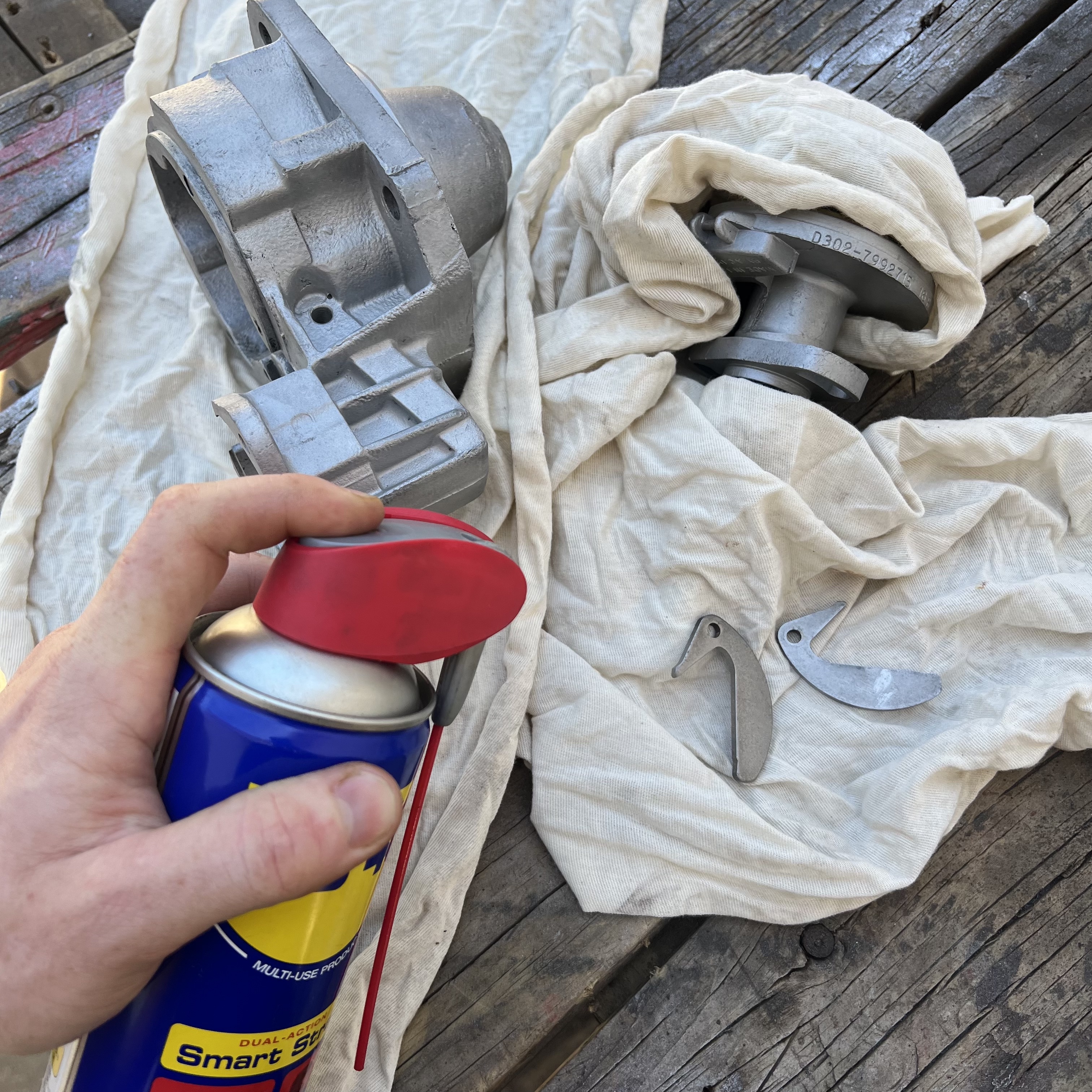 After disassembling and degreasing the Delco, I placed all its parts into a blasting cabinet to blast them clean with fine glass beads. After coming out, they needed to be washed clean once again, and then dried-off and lubricated for reassembly. This is where WD-40 comes in.