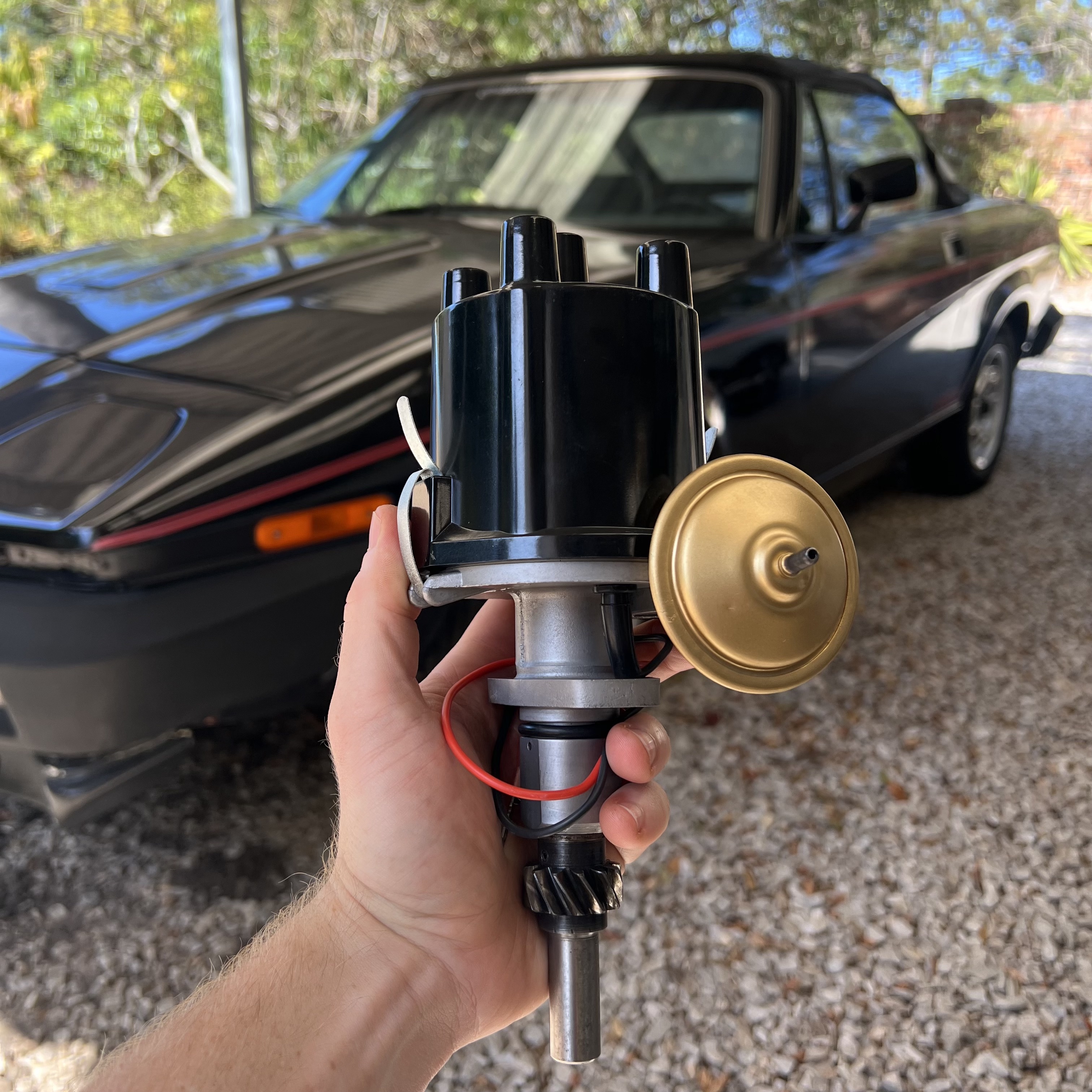With some luck, I managed to find a helpful fellow classic car enthusiast who had a set of the missing clips for holding the distributor cap on. I sent the clips out to a local business to be zinc-plated so they look just like new. With the cap on, the Delco is now finally ready to go back into service. Here, you can see the Triumph in the background, waiting to once again hit the road.