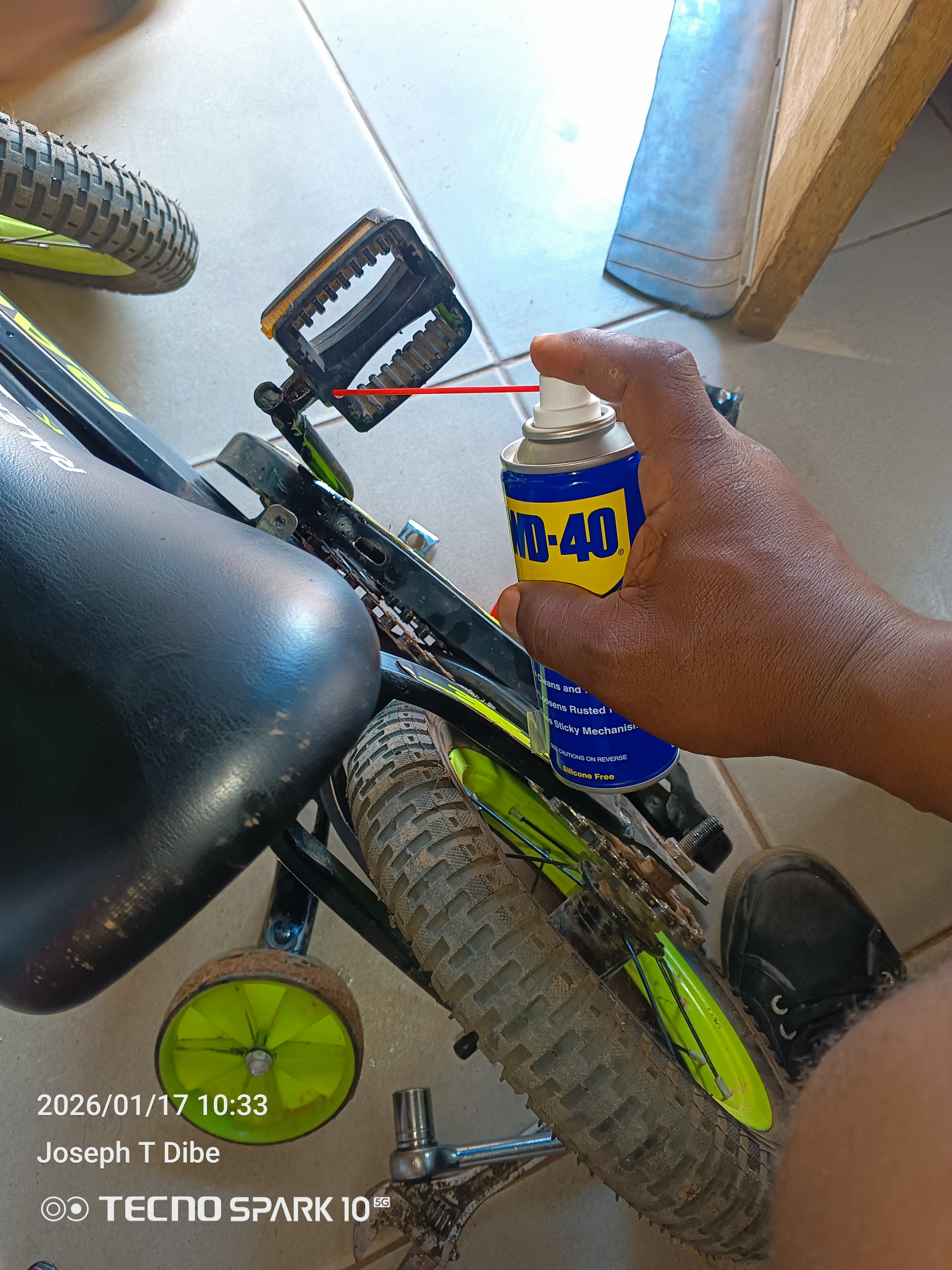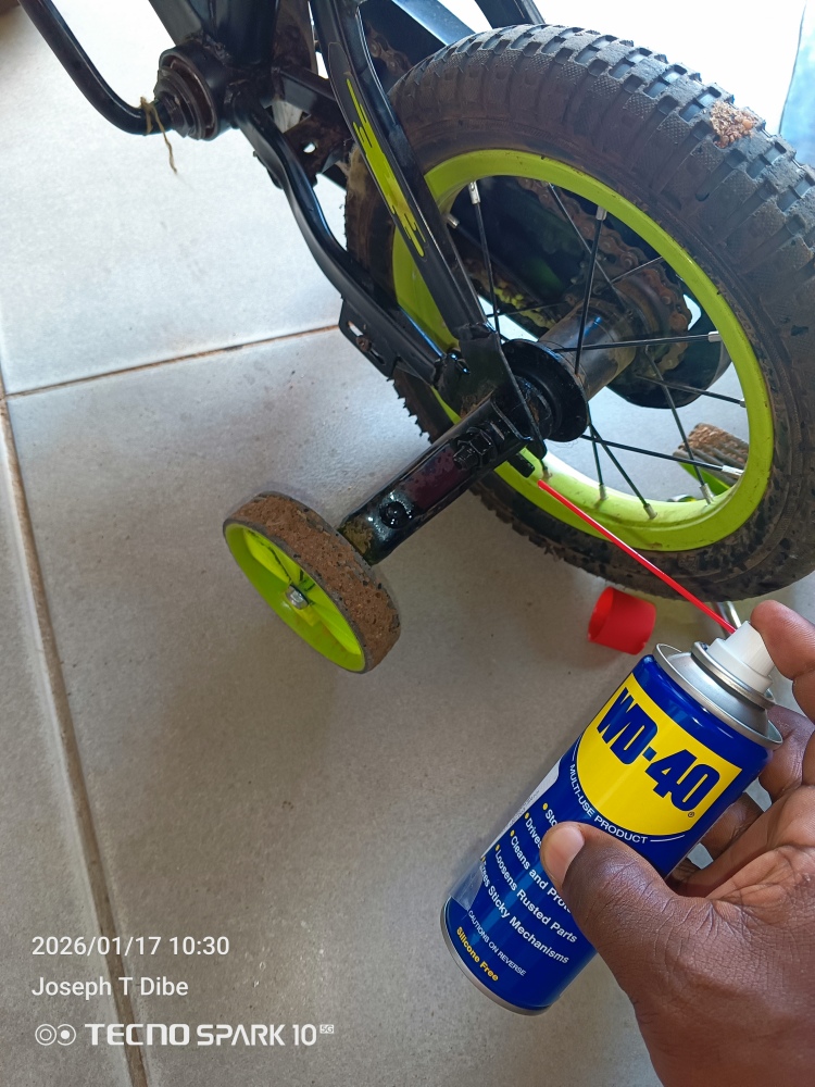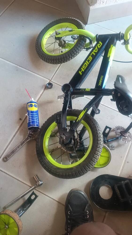 My son's bicycle had a paddling problem and chain coming off,so I took a look at it and found out that it needs ball bearing replacement then another problem came up of the stiff and rusty nuts.That where I started using my original WD-40 for lubrication and Walla magic happened I was able to dismantle the paddles and taking off the worn out ball bearing just like that now it's happy father happy son ,all thanks to WD-40.